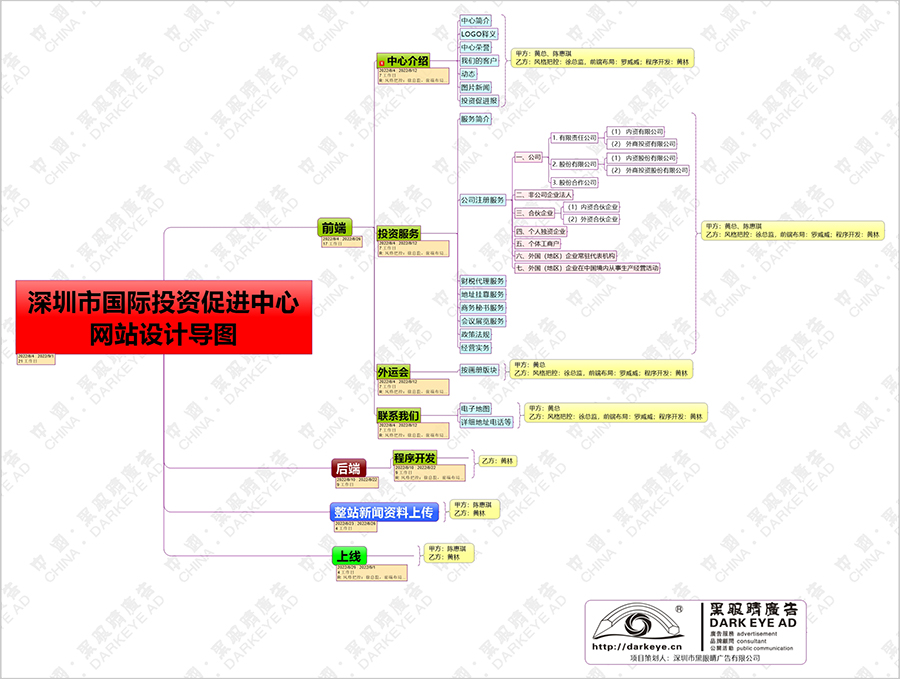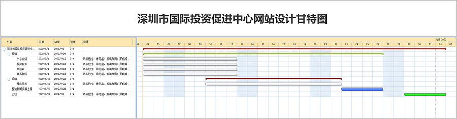這次官網(wǎng)改版,深圳市國際投資促進中心的黃總對黑眼睛廣告給予了很高的期望,黑眼睛廣告很快就完成了整個網(wǎng)站《項目完成甘特圖》和《網(wǎng)站建設拓撲圖》并抽調設計能力最強的網(wǎng)站前端設計師、架構師、程序開發(fā)人員,組成項目組開始項目設計。